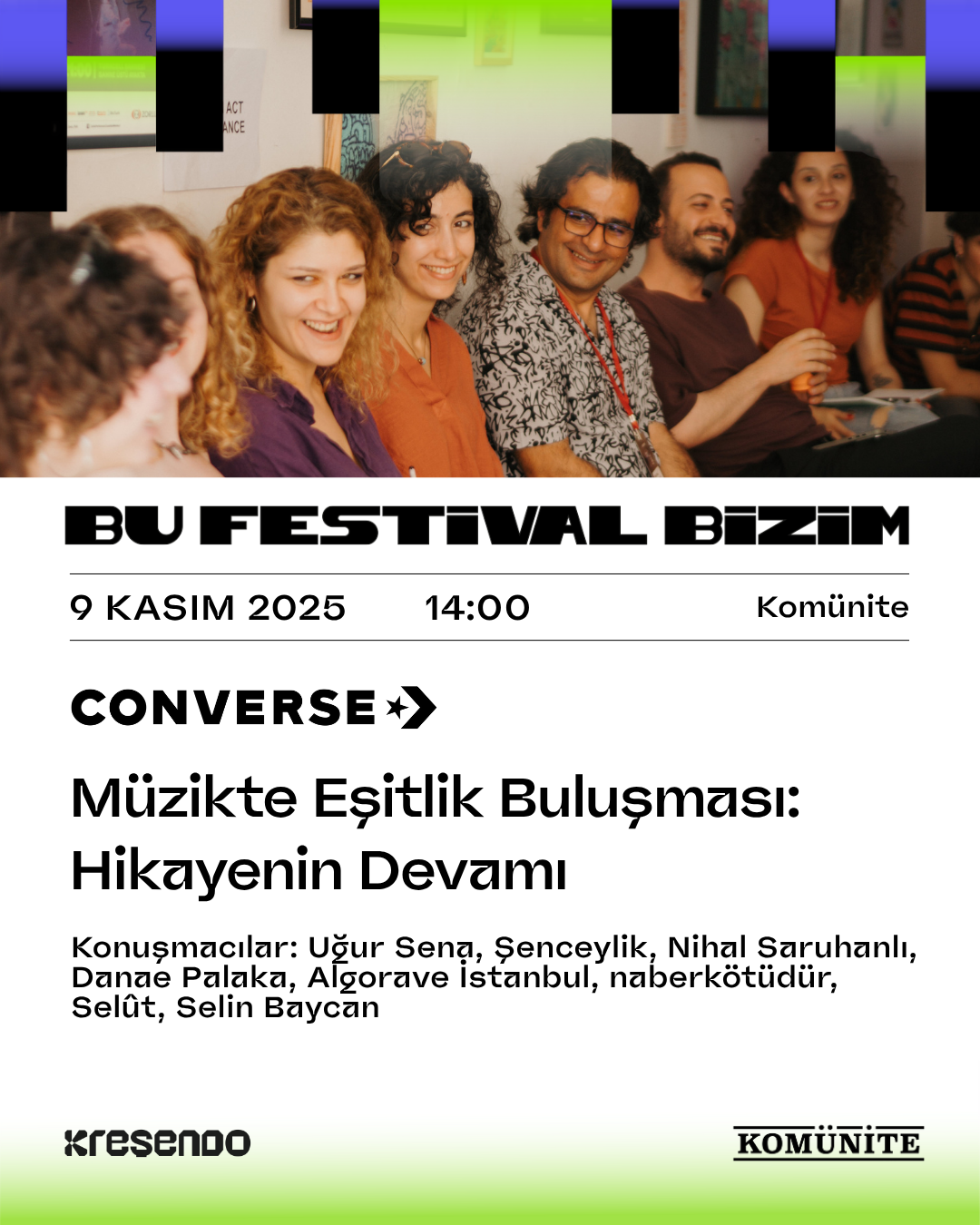 Müziği herkes için bir ifade, ilham ve keşif alanına dönüştüren platform. Festivallerden konserlere, atölyelerden eğitimlere dayanışmanın ve yaratıcılığın peşinden koşuyoruz. Çünkü sesler birlikte güçlü!