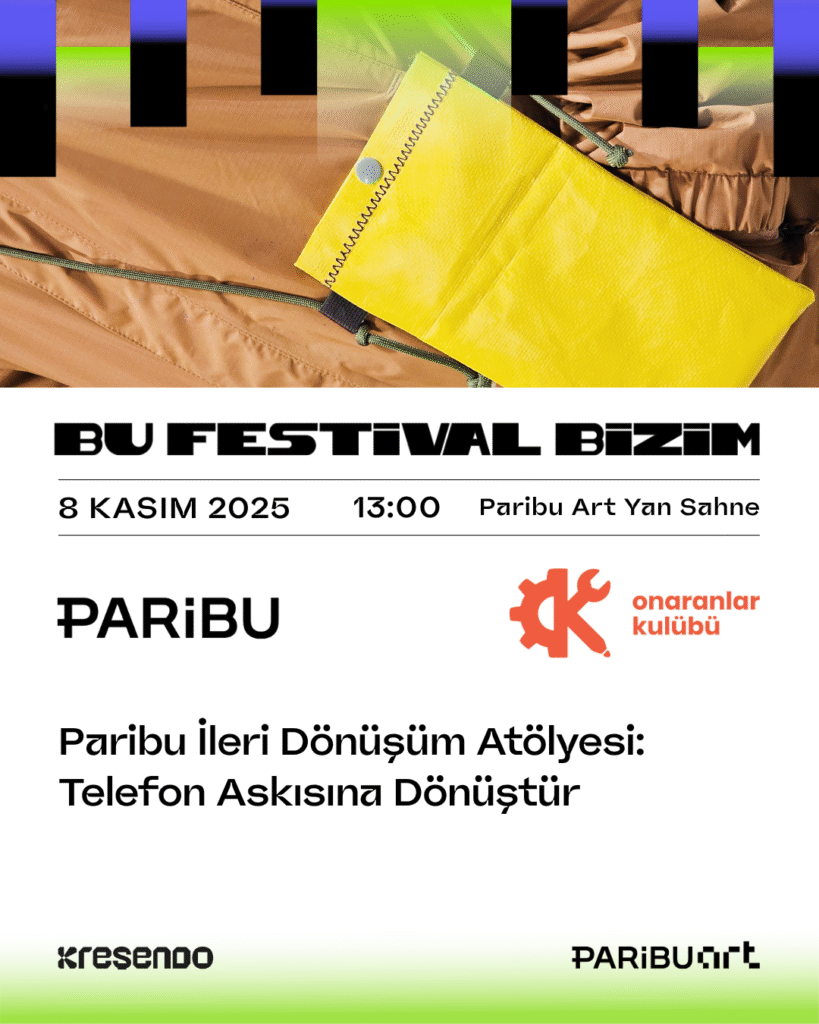 “Paribu İleri Dönüşüm Projesi” kapsamında, daha önce Paribu’nun açık hava mecralarında ve etkinliklerinde kullanılarak işlevini tamamlamış atık brandalar, Onaranlar Kulübü yürütücülüğünde festival katılımcıları tarafından kullanılabilecek pratik telefon askılıklarına dönüştürülür. Katılımcılar, brandalardan kesilen parçaları dikiş ve nakış yöntemleriyle birleştirerek hem işlevsel hem de sürdürülebilir bir ürün üretirler. Atölye boyunca brandanın kesimi, parçaların birbirine dikilmesi ve ürünün […]